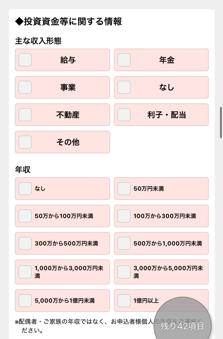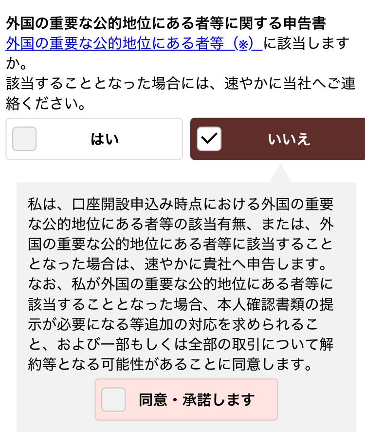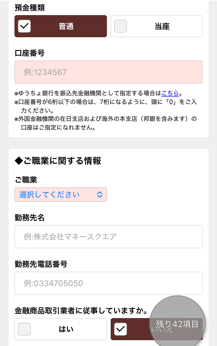 この時に口座開設者自身での申込でない回答すると(例えば「夫が口座開設をしてくれた」など)、「契約条件の本人確認が必要」という理由で再度の申請をしないといけません。